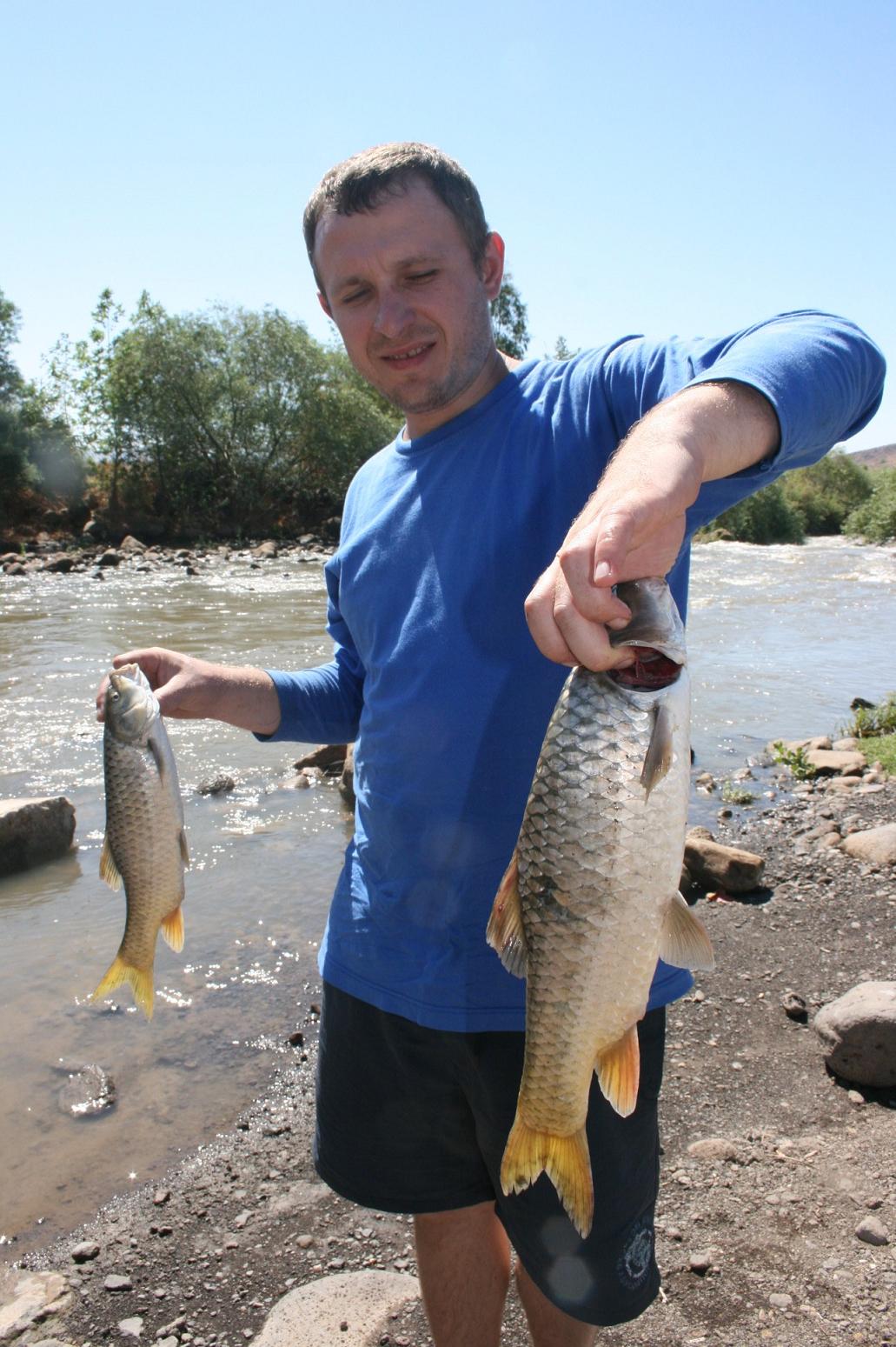 | 5.00 верховье иордана!погода супер,а вот с водой напряг,такое ощущение ещё пару часов и речка пересохнет совсем,ну если приехали то надо хоть покидать. Пару часов без результата свело всех с ума!Принято героическое решение спуститься в низ по течению. В 8:30 на новом месте и тут таже картина!Ни воды ни рыбы.И началось брожение туда сюда результат 0!!!!(1усач средненький) В 10 началась подниматься вода и тут попёрло !!! Поклёвки следовали одна за другой было много сходов(причина ещё не ясна ) и так в течении полутора часов(за это время около двух десятков усачей от 300гр и до 1.5кг )а потом вода стала резко уходить и мы вместе с ней! Это наш первый отчёт и первая удача