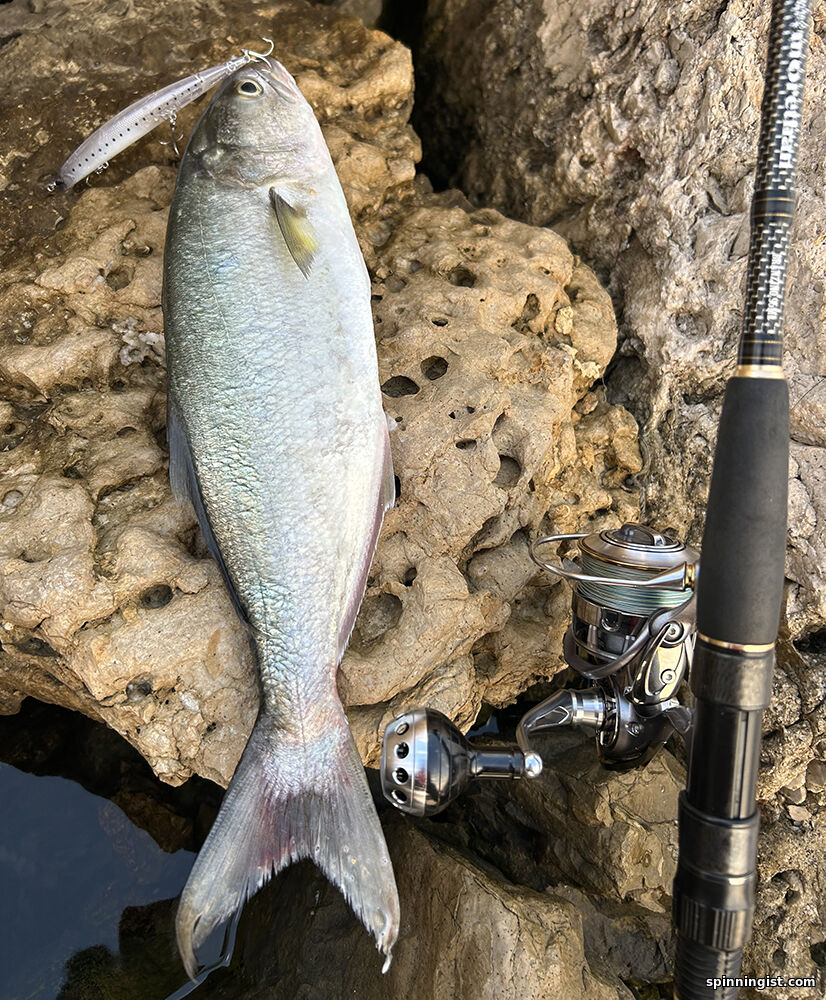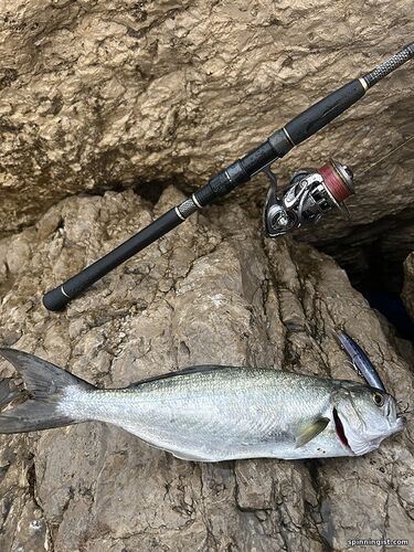 | Решил бросить все дела и выйти на берег в нечётное число. Сначала на моретан что-то напало, но промахнулось. Потом села барракуда и снова злая - порвала мне леску на узле на берегу. Потом еще одна уже на берегу отцепилась, не охота было мочиться, можно было б ногой прижать, ладно пусть живет. Также дуо привез паламиду. Вроде всё, срезал метал. поводок, привязал карабинчик и решил покидать мелкие приманки погуляв по берегу. И тут неожиданно шарик принёс рыбу. Паламида рыба бойкая, я уж подумал судьба мне красивого мусара подбросила. Дуо тайд минноу слим 18гр , дайва моретан икс кросс 18,5гр. , мегабас икс 80 бит 11,5гр.