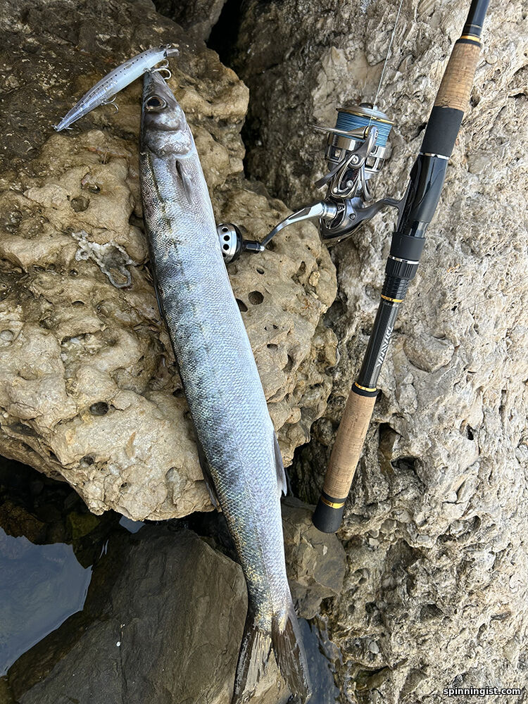 |  Подарок от Нептуна , с утра цеплялась всякая мелочь , но настрой был боевой и море было живое , рыбы было много , но крупная только дразнилась и не хотела атаковать приманки . Перешел на бомбет и ситуация кардинально изменилась в лучшую сторону . На очередном забросе бууум и фрикцион заиграл любимую мелодию , под музыку фрикциона , после непродолжительного танца по камням , соперник на другой стороне нитки сдался и оказался на берегу . Не ожидал я увидеть такого красавца в конце ноября