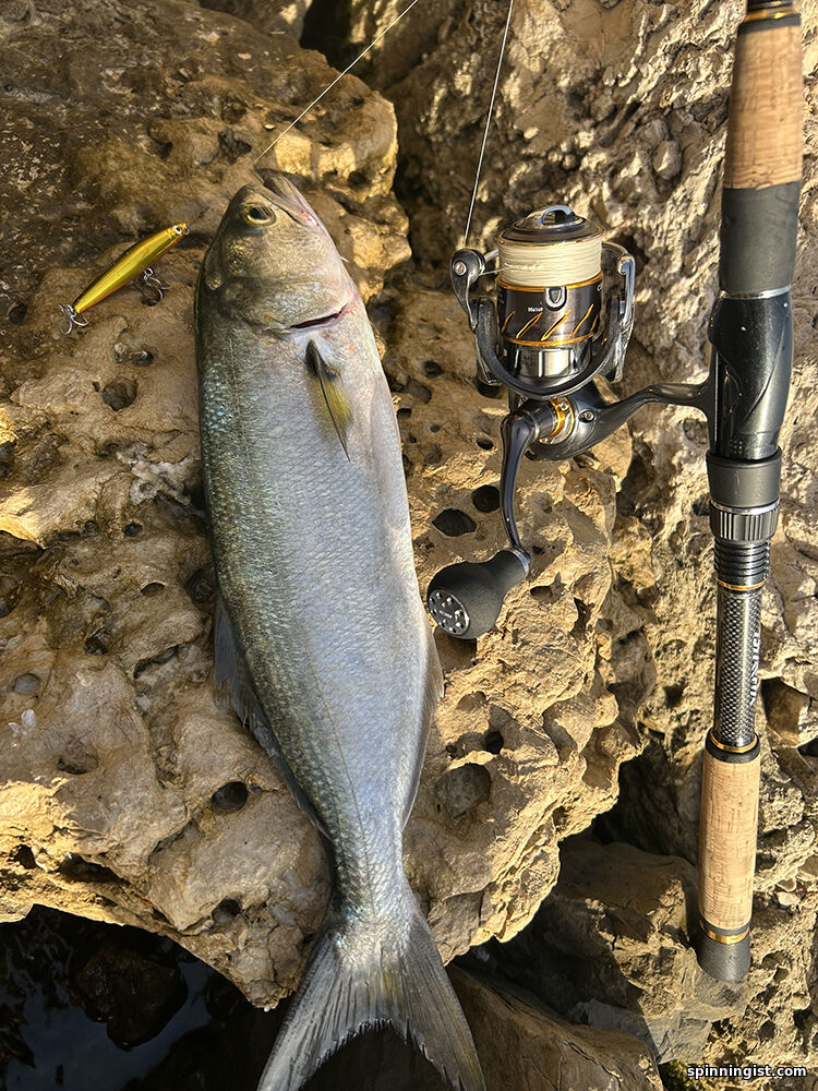 | Сегодня море наконец-то вроде приутихло,и я отправился за город половить хищника . Вскоре я осознал ,что всё море наполнено водорослями ,прибрежные волны насаживали на плетёнку гирлянды. В таких случаях, если кто и схватит воблер то в процессе вываживания ,нанизается столько, что всё может запросто оторваться. Пришлось пойти в другое место, там, конечно, было поопаснее -ударяли волны, но после несколько забросов моего любимого попкея, я ощутил удар... да- силён бродяга! хорошо что он держался вдали от рифов и размотал плетёнку ,иначе он бы её точно обрезал об рифы! когда он устал ,я подтянул его на мелководье ,он выпрыгивал из воды демонстрируя все свои возможности! Серии глубинных волн сбивали с ног, и,если бы он меня не держал с той стороны,могла бы быть и амба!