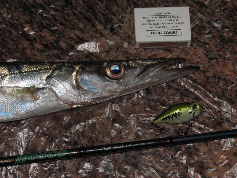 | Вечер добрый. Вот и мне пришла очередь писать отчёт. Очень долго не был на воде, но руки пришли в норму и сегодня после тренировки решился выскочить с УЛ на Ашкелонскую марину - проверить как это бросать спиннинг и опробовать несколько новых приманок. В 16:50 у воды, вокруг поплавочники набивают пакеты 5-тисантиметровыми арасами и мармирами. Достаю стандартный арсенал и мечу его в воду. Результата - ноль. Только один слабенький выход на 65-й Саммик и всё. Начал пробовать новинки - сперва тонущую собачку-слайдер, понравилось, поставил 3D Crank - неплохо, но отлив, все камни выпирают. Предпоследним оставался странного вида и цвета крэнк от Cultiva - ума не приложу зачем я его заказал. После тренировки состояние медитативное, проводка замедлена до срыва игры, в зубах дотлевает сигареты и заброс решаю считать последним. Тут воблер за что-то цепляется хотя до команей ещё метра 3-4. И это что-то начинает устраивать свечи и ныряния. Пара стоящих рядом пацанят (обозвавших мой крэнк фалафелем) начинают орать на 2 голоса "барракуда" и через несколько минут я действительно стою сжимая в одной руке спин а в другой ту самую барракуду что покусилась на 48-мм крэнк. Выражение лица у меня было абсолютно идиотское, особенно после того как несколько арабов спросили меня где я покупаю снасти. Т.к. отвечать на бесконечные вопросы уже не было сил, то побросав ещё пару минут для приличия я отправился домой фотографировать и обмерять трофей. Длина составила 64см, вес - между 900 и 1000, при мелком росте толщина оказалась весьма немалой.