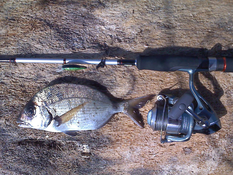 | Телевизор-переросток хватанул на втором забросе. "Не к добру", - подумалось, учитывая предыдущую рыбалку, когда такая cкорая поклевка была и последней заодно. Ну, оказалась не последней, но статистика поклевка/сход сегодня на редкость отвратительная. 6 или 7 незасекшихся толком сарагусов, хотя стоял свежий тройник, а не всякое что-то там. Клевало на достаточно медленной проводке, так что, возможно, хватали они его за нос/пузо, а не вдогонку. Единственная прочно севшая сарагусиха клюнула в узенькой (ну сантиметров 15) и длинной расщелине в рифе, куда удалось как-то загнать воблер в достаточно беспорядочной утренней волне. Острых ощущений добавил кратковременный ливень под приличным лобовым ветром (ветер не радовал с самого начала). Потом вылезло солнышко, море устаканилось и клевать перестало. Ну, а главное событие - первый сарагус на воблер у жены, покорительницы усачей Так что, есть почин. Дальше - больше.