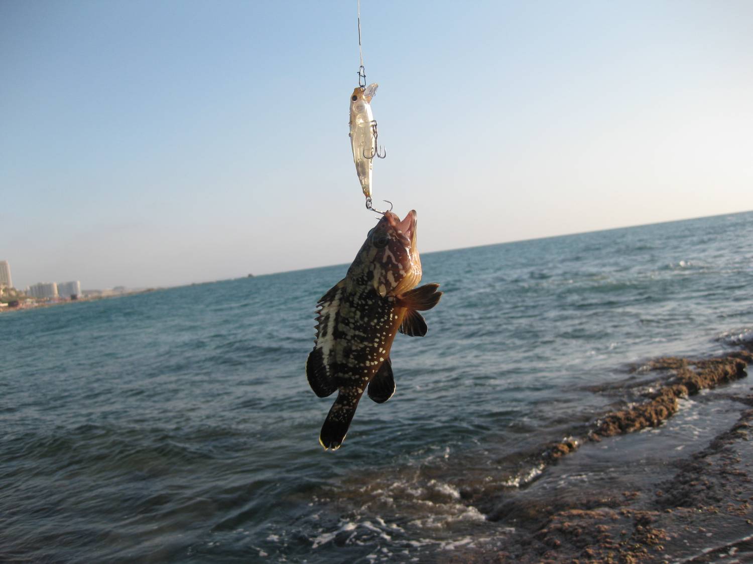 | Утро было тёплое и как оказалось, удачное. Чесно говоря не думал, что получится что нибудь поймать, так как море не высокое и вода на столько прозрачная, что даже в сумерках видно камни за несколько метров. Вышли с naag-ом в 3:15 утра, к берегу подошли через минут 15, решили разделиться он на рифы, я на песочек. Первая поклёвка была гдето часа в 4-е и прямо перед берегом сход, можно сказать под самым носом сошёл лаврачёк. Я его даже разглядеть успел......около 45см. вдоль берега шёл всё не хотел вылазить на песок, жаль....но бывает и такое И всё же сегодняшнее море оказалось щедрым, дав мне ещё один шанс и его я уже не упустил ps. кстати пятнистого я ещё не ловил......вай слющай какой красавесссс.