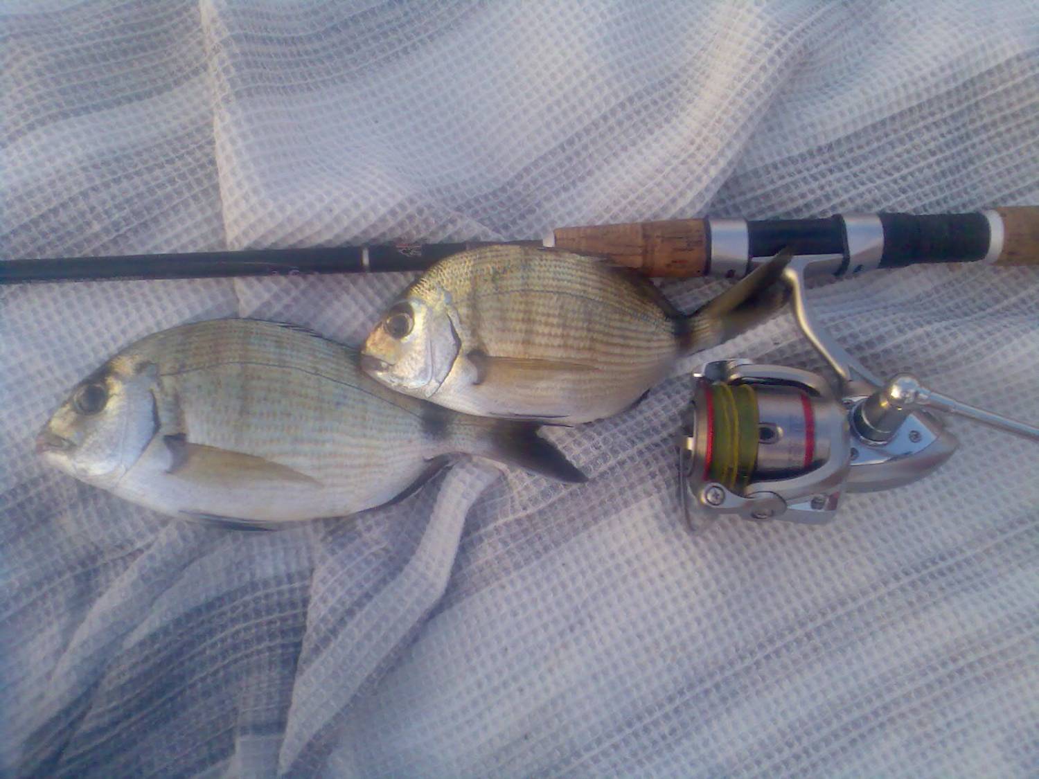 | пошол мой сын первый раз на море покупаться. ну и меня с женой взял. я подумал, что может будет часок, прихватил удочку. минут пять рыбалки, очень странная поклёвка, дёргает попарно. дык дык тишина, думал волной о камень бьёт, на всякий случай подсёк, очень легко без сопротивления (странный сарагус) вывел на мель. бой он дал только когда я его в руки брал. ну ничего не сбёг.ещё минут пять, опять поклёвка, бой слабый даже фрикцыон не подтягивал, вывел. ещё минут пять и сын захотел домой. в общем минут двадцать рыбалки и пара сарагусей.