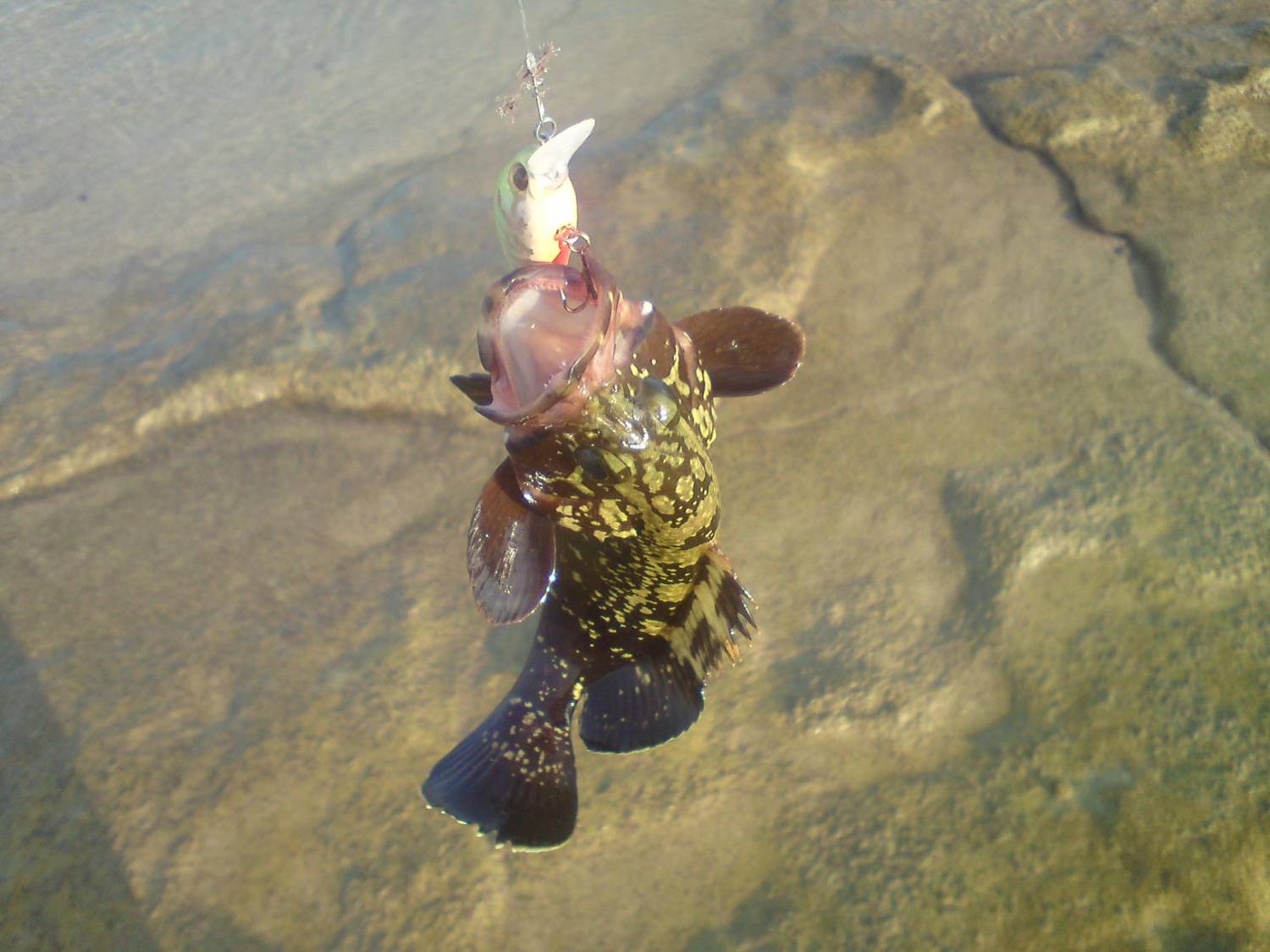| Вчера с Вадиком /cara68/, решили проехаться на север или юг . Короче приехали. По тёмному кто-то гонял малька в заводи. Светало.Море ровное.Но тут кто-то вдоль рифа погнал малька.Кидаю тетру,поклёвка.Какая то вялая.Останавливаю приманку,что то на том конце дёргается. Вытащил,чтоб он был здоров.Ну чуть больше тетры.Потом сменили спининги на УЛ. Заброс,удар ,потяг и всё замерло.Отпускаю нитку,жду .Этот гад сидит под карнизом.Потом он решил ,что его ни что не держит,вылез из под карниза. но только на секунду обнадёжил меня.Шансов вернуть приманку ни каких.Иду на краёнюю меру.Благо Вадик рядом. Разгрузка ,сумка на песке,Вадик с моей палкой.Ныряю. С первого раза не нахожу места схрона этой сволочи. Опять ныряю,на этот раз глубже,достал ,вытягиваю за нитку и на поверхность.Вадик с асестировал чётко. Чёрный убийца УЛ на суше. Следующий локус после нескольких кадров на память отправлен во-свояси. Потом были сарагусы,смена места,опять заплыв. Наэтот раз голимый зацеп,Сложное возвращение на риф. Бороться с течением в одежде и ботинках очень тяжело. Кофе.И домой. Поездка удалась.