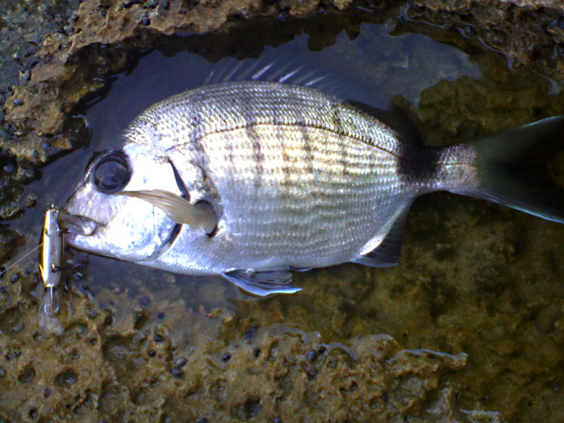 | Мда, мужики, могли и больше рыбы оставить Че-то сегодня все было как-то так. Так как-то. Невысокие хаотичные волны, сильный недолив воды, липкая жара прямо с утра, сонный я, отсутствие в коробке самых надежных воблеров, погибших накануне. В итоге, полетных качеств 35-го дипа (самого летуна из выживших) хватало только на то, чтобы на метр-другой перелетать кромку сильно обмелевшего рифа, преодолевая сопротивление ветра. Так и прошлялся с 6 до 9, с трудом выковыряв двух более-менее зачетных сарагусов, трех вобще незачетных и одного локусенка.