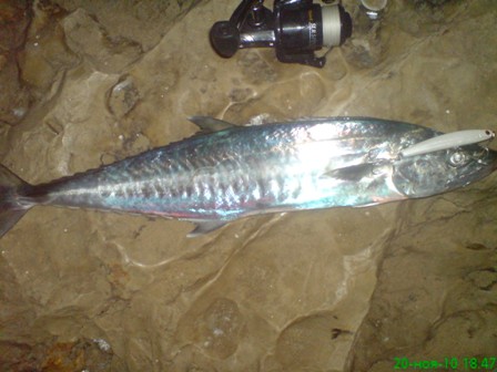 | и мне вчера досталась доза адреналина! 1. Число, время суток, когда была поймана рыба. (есть на фото) 2. Состояние моря, погода. (можно сказать спокойное) 3. Примерное место рыбалки (риф/песок/волнорез). (стоял на рифе,бросал в глубину) 4. Предпологаеммый рельеф дна, глубина. (не ровный,рифистый) 5. Снасть (палка, катушка, плетня ...). а)Feather FE-230UL 3-15g б)D-A-M quick slr spin 530 fd 2500 в)power pro 0.15mm 6. Приманка. pointer 90, 12g, 7. Вид рыбы ее вес и размер. +- 600mm не взвешивал
