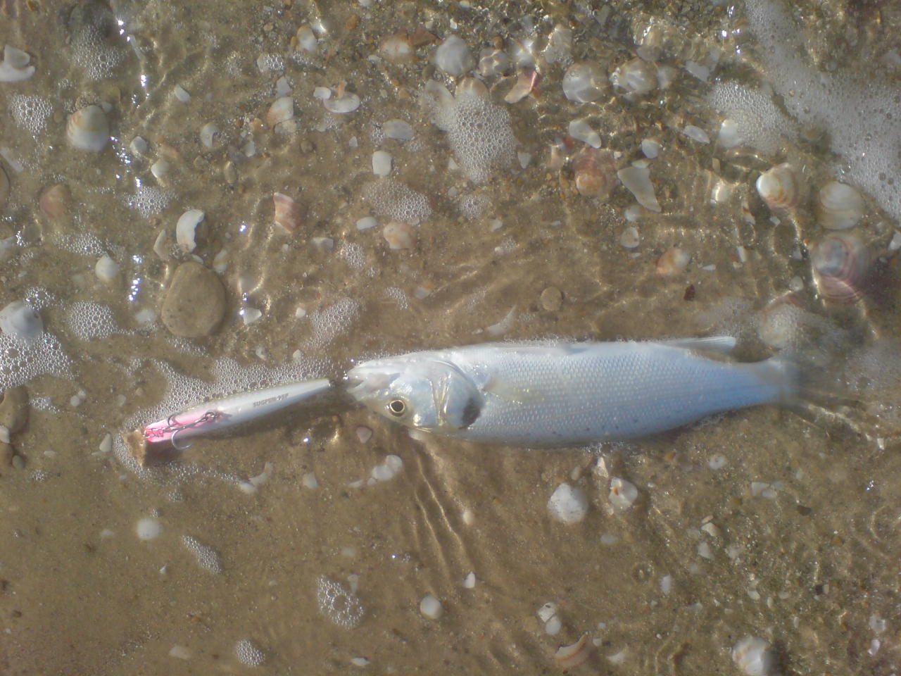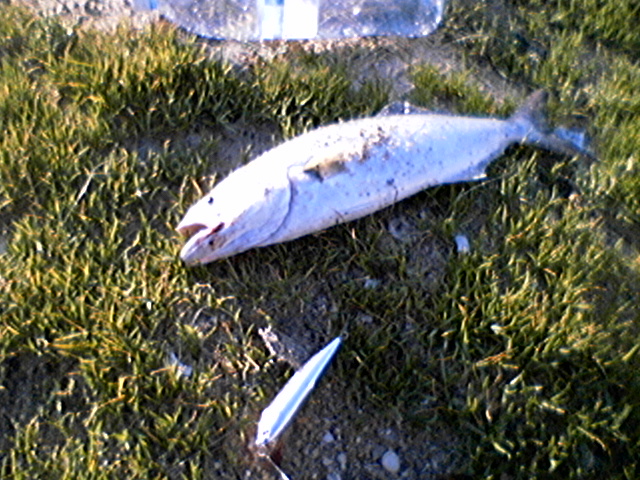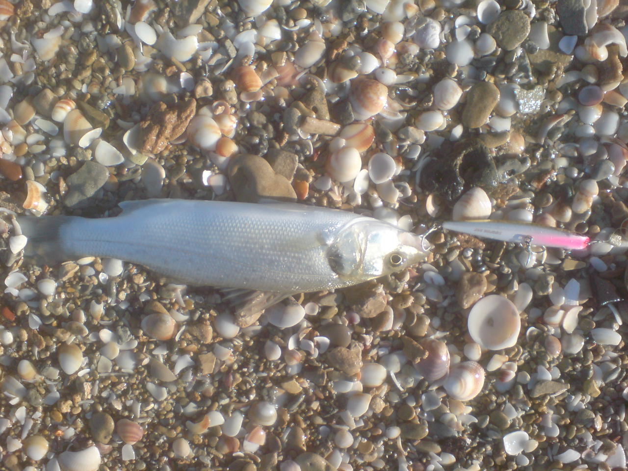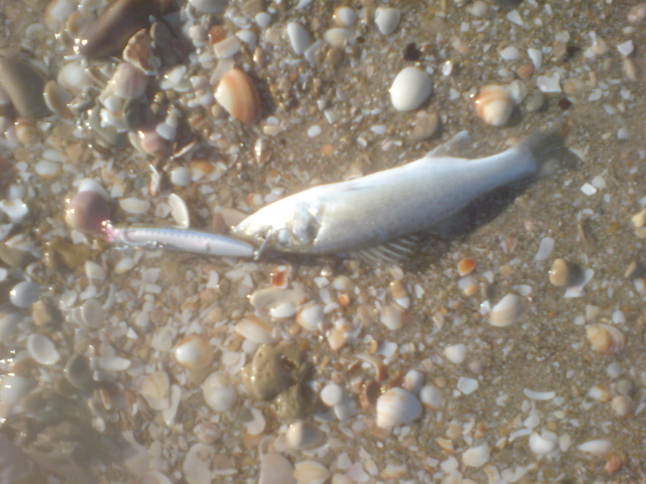 | День сегодня выдался на славу,и в смысле погоды и в смысле улова. Две результативные поклевки, один сход и откушенный комомо пошел в подарок нептуну. Теперь по порядку. Встал с утречка в 4.30 ,туда -сюда к морю приехал в начале шестого. Вообще хотел посвятить день кальмарам и покидать бубу. Но как только подошел к воде смотрю пиршество вроде начинается.Нет думаю кальмары подождут.Ставлю самика 100 заброс в то место где только что выпрыгивали мальки и еще не успел выбрать леску как получил первый удар. Зацепился небольшой лавраченок ,сантиметров на 25,поэтому борьбы не получилось .После отцепа был амнистирован и отправлен домой.После этого минут 10 тишина,и вот на очередном забросе самика визг катушки,палочка в дугу, адреналин в кровь и сход. Делаю повторный заброс в то-же место и опять удар , и тут я получил полное удовольствие от вываживания этого парня. Его рост был замерян дома и составил 44 сантиметра.После этого был еще один сход возле самого берега. Все это продолжалось в течении 30-40 минут после чего все стихло.Я еще немного прогулялся вдоль берега и на обратном пути к машине ставлю комомо 125. 4-5 забросов без результата.Уже собирался идти к машине как на последнем забросе удар , палка в дугу и вдруг леска ослабла.Выматываю уже конечно без камомы. Флюрик срезан был как бритвой.Кто это был я не видел,но видать был послан Нептуном за данью в виде комомы. Вообщем день прожит не зря,масса положительных эмоций не смотря на потерю воблера. Фото не очень ,так-как фоткал телефоном.