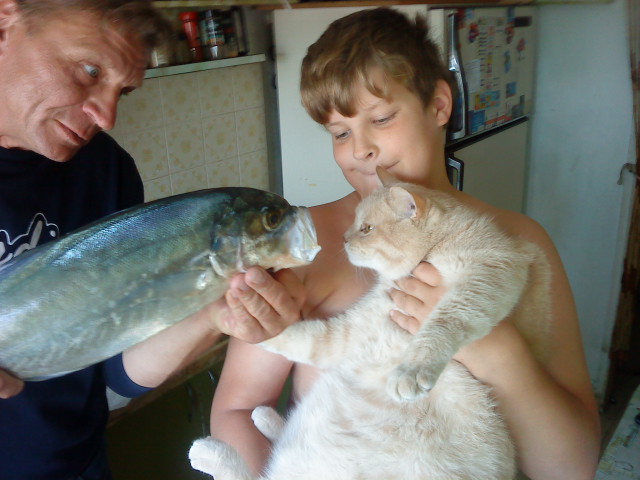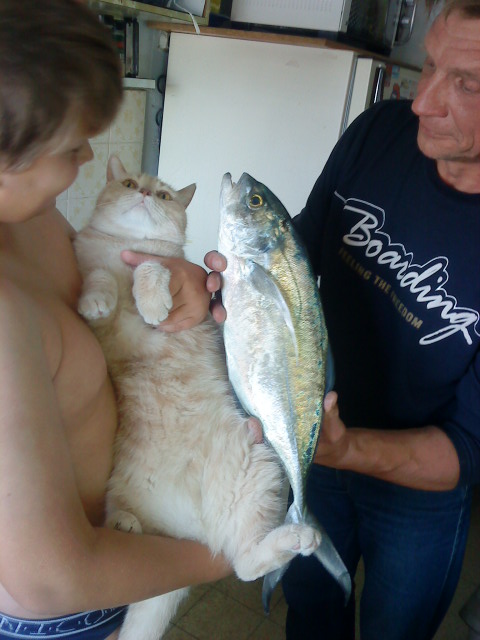 | А кота держит мой сынуля, маленький 12летний мальчик, тоже рыбачок. А что, мальчонка маловат или кот велик????