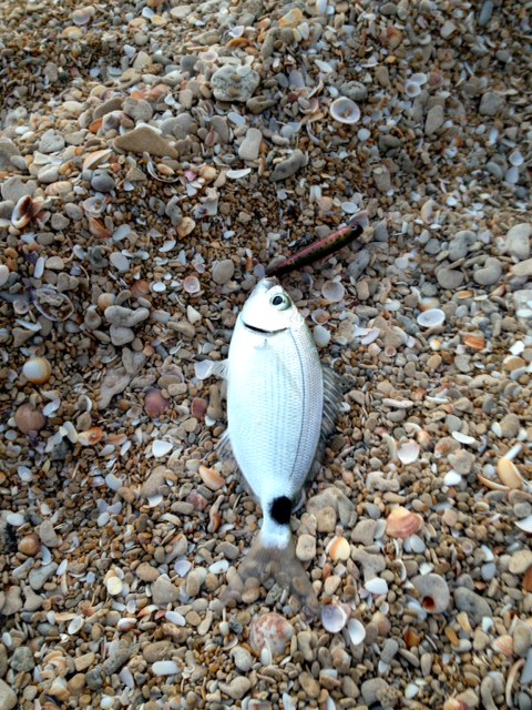 | Последние три недели все выходы на море были практически безрезультатны. Менял точки, шел то утром, то вечером, брал оба сета - ноль. Даже сарагусы на любимом рифе нагло игнорировали мои гальпы, ригги и т.п.. и предпочитали лакомиться мясом или тестом у моих любопытных соседей - поплавиков и доночников. Вчера вечером решил съездить на часик, попытать удачу еще разок. Снарядил свой зальц ганфишем и при первом же забросе, зацепил вот этого малыша. С релизом были проблемы - он жадина проглотил весть тройник. надеюсь все еще живец.