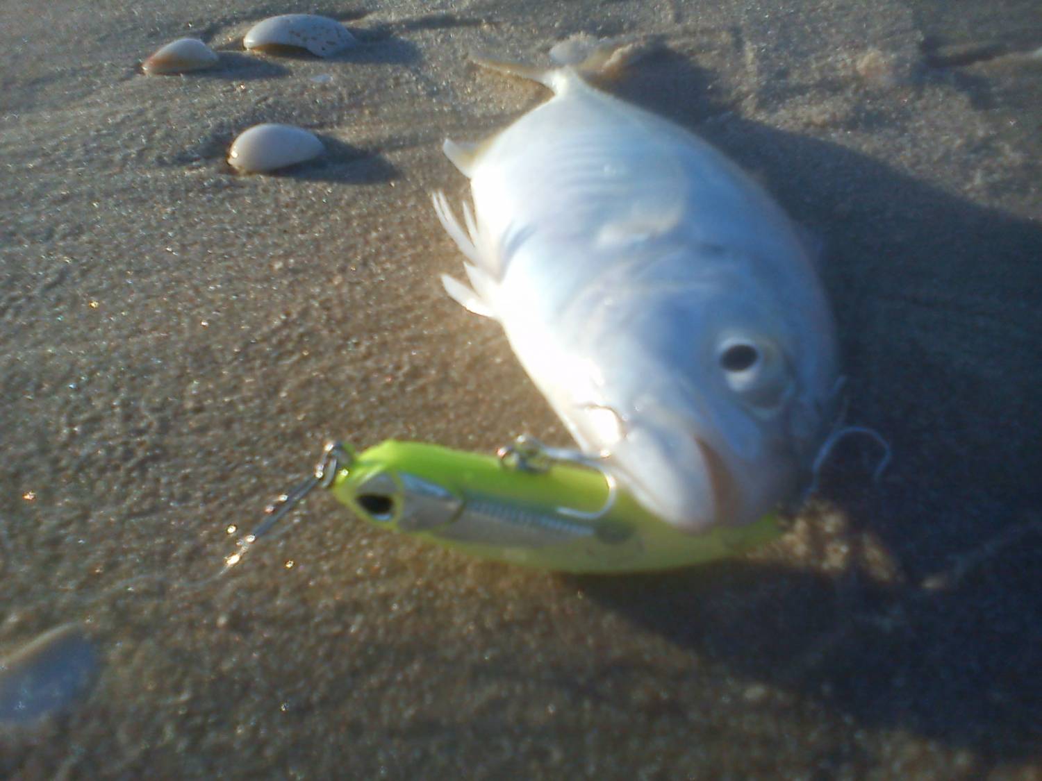 | РЫПА сегодня поймать не удалось. Правда было одно преследование, по-видимому лаврак, но не захотел он... Были три маленьких локуса на силикон, все отпущены, один из них совсем малыш, всего вдвое больше силикона. Посему перешёл на гальпирование. Порадовали своим размером мармиры. Когда взял бОльший, было впечатление , что попался лаврачок с песочка, так он тащил.