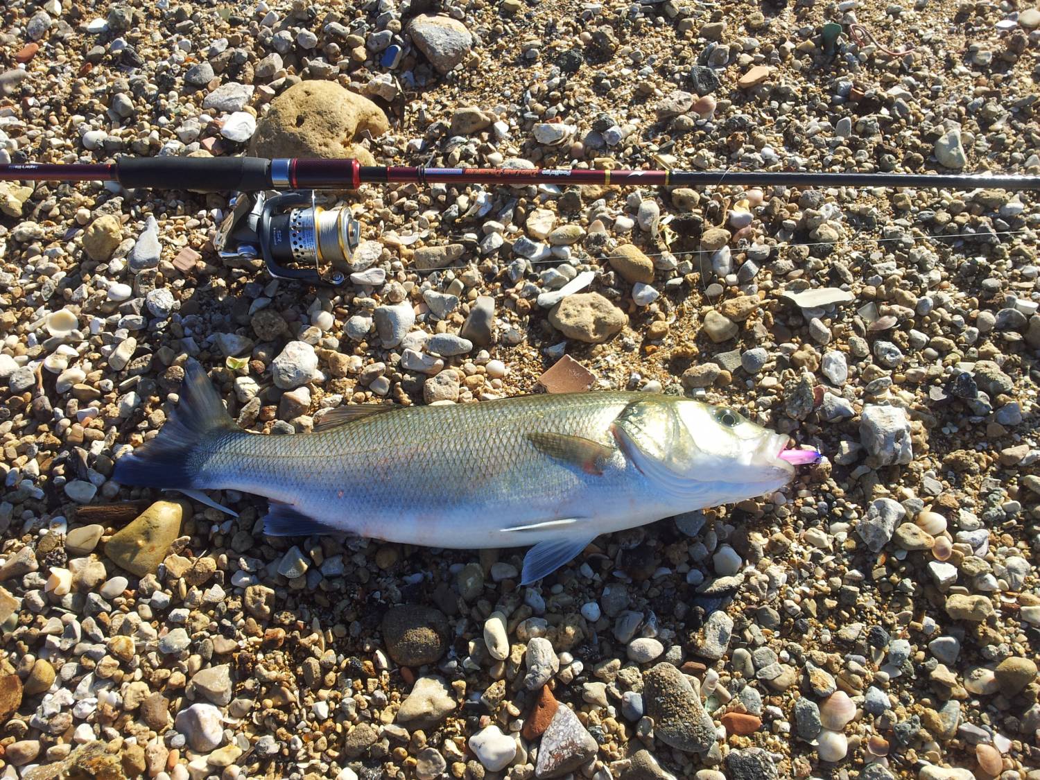 | С утра покидав приманки был абсолютный ноль даже малька не было видно. В 7:00 уехал домой,что бы отвезти домашних по своим местам.В 8:30 вернулся обратно,надел вайдрсы и пошёл гулять по рифам. Нашёл обратку с рифа,делаю несколько брасков комомой и на одной из пауз получил подтяжку прям у самых ног. Пару минут борьбы в обратке и лаврак на 47см. на берегу. [size=12][/size]
