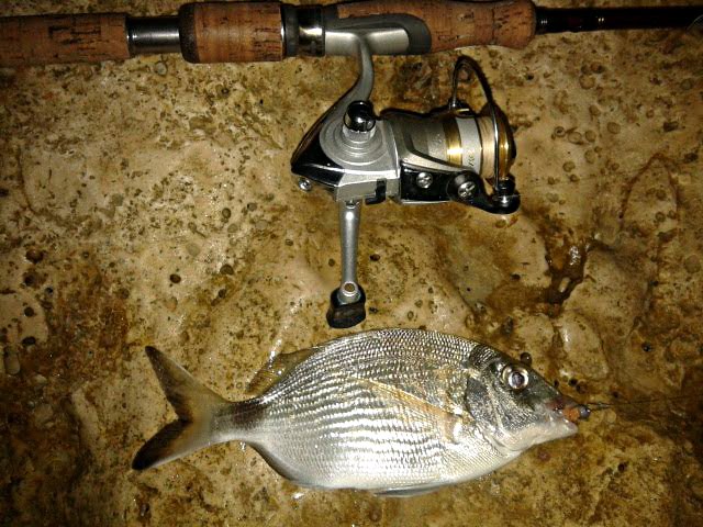Сегодня выскочил на час на море и продолжал изучение МДЖ. Поклевки были практически на каждой проводке, но телевизии почему то сегодня не засекались, довели меня до белого каления. Если бы не сарагусы... их было. Немного но было. А вот этот загнул ул удилко в бублик и раскрутил фрикцион я думал там звЭрь, а вылез сарагусик на хороших 25+см. Однако боец покруче лавраков на 50+см
