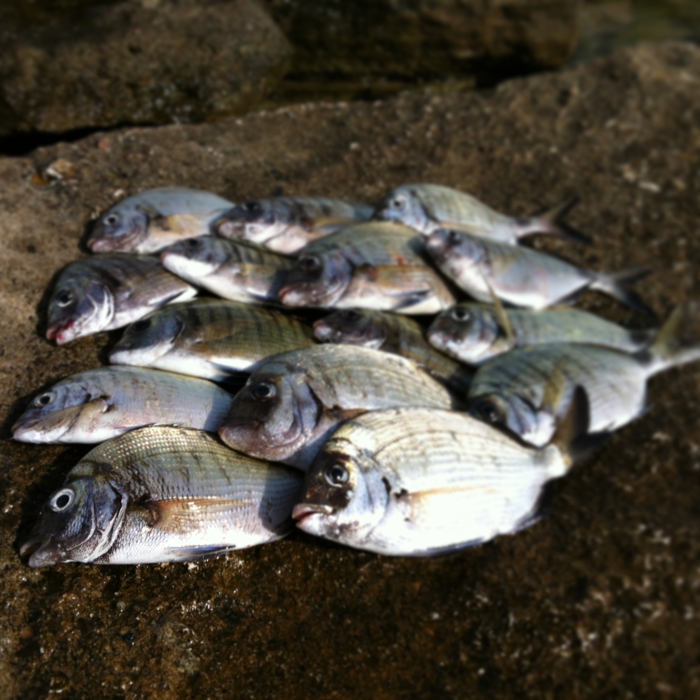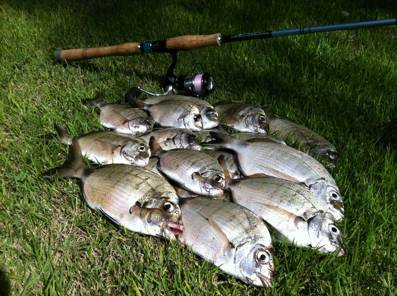 По итогам первого дня он конечно сломался. Второй день можно смело назвать днём плюшек. Несколько особей порадовали своими размерами. Брали жадно, заглатывая периодически так, что без хирургического вмешательства было не обойтись. Было явно и пару монстриков, которые перекусили лидер №1.5. Один сарагусь меня изумил. Насаживаю хороший такой, длинный кусочек, заброс, проводка, тык-тык - сидит, по дороге сходит, забрав всю наживку. Насаживаю последний обрезок, заброс, проводка, тык-тык - сидит. вываживаю, поднимаю, беру в руку и диву даюсь.... такое я видел в первый раз при ловле сарагусов. Это оказался тот жадюга, что клевал пару минут назад и тырнул у меня 5 см обрезок червя. Сарагус был небольшим и половина длинного червя у него ещё торчала из пасти, а он хапуга на ещё позарился. День второй.