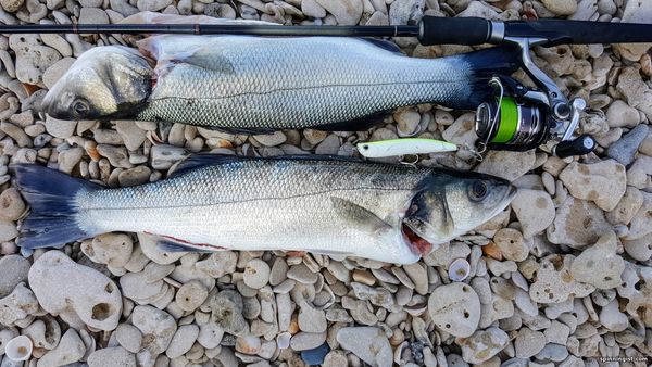 | лавраки близнецы. 2 поклевки, 2 лаврака на берегу. Оба дали хороший бой. По спокойному морю, ловить на топвотер одно удовольствие. Выходы, атаки - как на ладони.