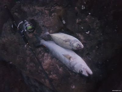 | В моцей шабат жена с детьми к теще , а я долго не думая хватаю спин и через 20 минут на море.40 минут прыжков по рифам и первый тарахун идет в мешок . потом еще пару не понятных тычков и ничего .... Солнце почти село я одеваю фонарик и занимаю место в первом ряду возле любимой ямочки . первый заброс и сразу удар пару минут и рып сходит прямо у ног. еще с десяток бросков и опять удар на этот раз рып сушиться и отправляется в мешок к тарахуну. возвращаюсь на точку бросок пол оборота ручки и злой гумбар с вобом во рту скачет по волнам как сайгак меньше