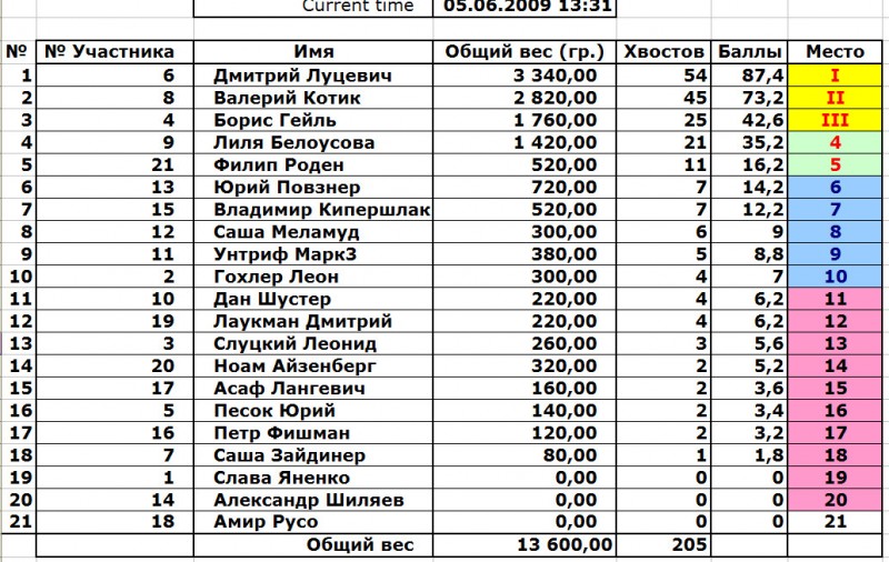 Хочу поблагодарить организаторов соревнований, все было на высшем уровне. Судьи молодцы, мне ни разу не пришлось потерять даже минуты на их поиски, хотя я прогулялся до самой границы зоны ловли. Спонсорам спасибо за замечательные призы. И конечно, особая благодарность достойным соперникам, в особенности Валере Котику, без них это не было того интереса, азарта и адреналина, который я получил на этих соревнованиях.