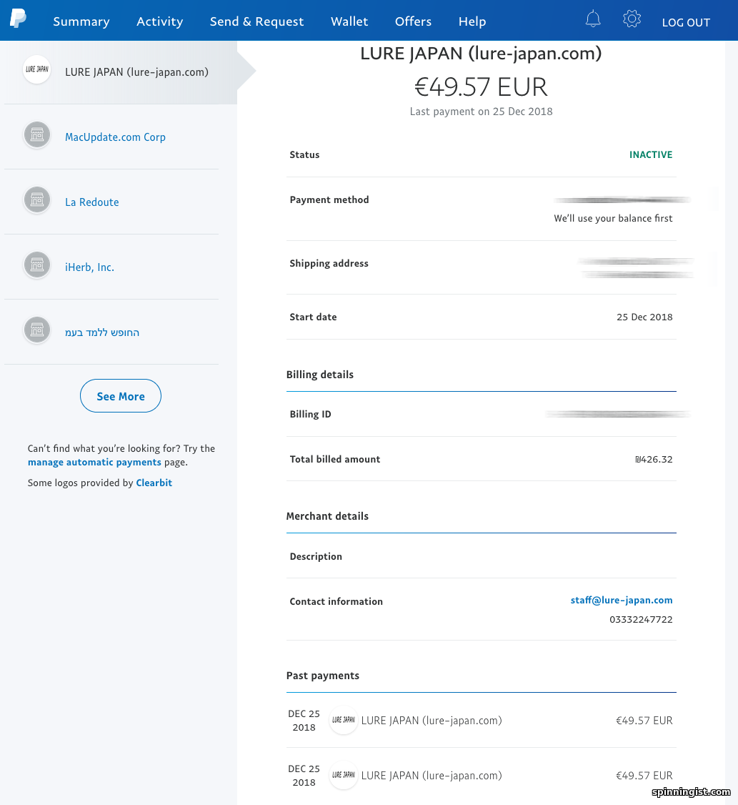 В связи в Lure Japan я полез в PayPal и был неприятно удивлен что я подписан еще на ряд магазинов. Магазины приличные - iHerb, La Redut, в которых я просто делал покупки и не участвовал ни в какой подписке.