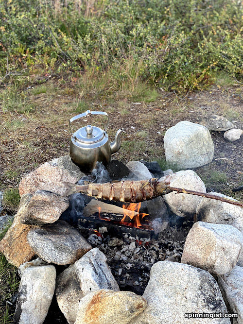 Поигрался еще часик ,окончательно отпустило.Голец мечта,кумжа приятный прилов, а вот хариус не подвел. Пошел готовить вкусняшку,хариус на рожне. Рыба не потрошится,только счисщается чешуя,надевается на палку и когда костер почти прогорит, палка устанавливается над углями. Хвостик не осилил, оставил на потом. Все же хочу гольца. Время еще есть, иду на озеро. Несколько раз сиг играл на растоянии заброса, но ничего из того ,что у меня было,не брал. Коробка с мухами в машине(каких то 17км ), а заморачиваться с их изготовлением не давал всеядный хариус. Стоило солнцу зайти за холм, появились миллиарды комаров и мошкары. Они грызли и кусали так, что опухли руки и лицо, отекли веки. Я всерьз задумался,что противо анафелактического есть в моей аптечке. Через пол часа организм справился с угусом какой то лохматой твари,а вы видели лохматого комара с лохматыми мухами? Погода опять поменялась и задул холоднючий западный. Эта часть маршрута пролегала в каньене, вытянувшемуся на десяток км с востока на запад. Вторая ночь в избушке, температура упала, и если днем ходил без майки, то ночью затопил печку. Сегодня я один вообще. Завтра выдвигаю дальше на восток.