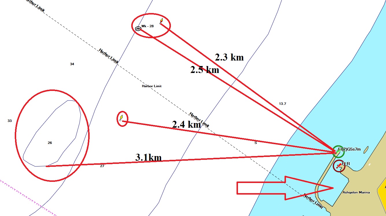 | две самые излюбленные точки ашкелонских каякистов находятся на удалении 3,0 и 3,5 км от берега и марины.